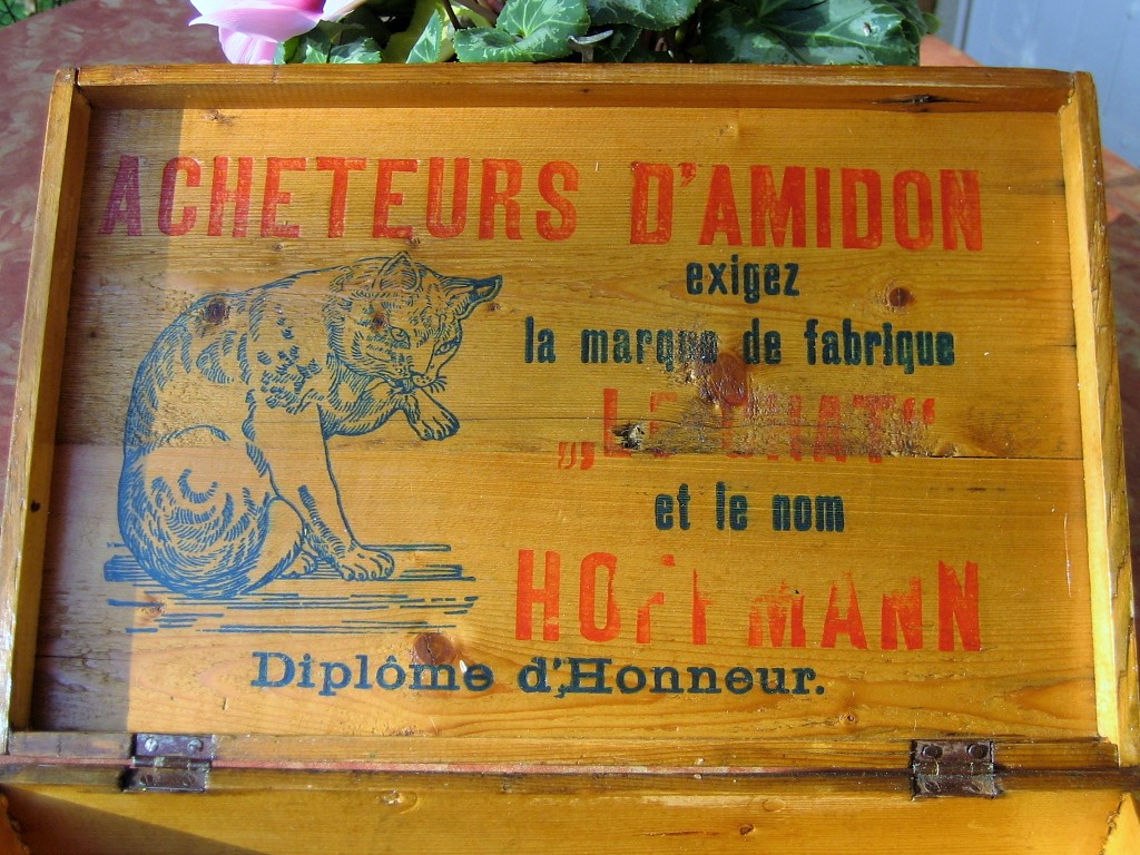 Objet chargé d’histoire dessiné en 1930 par un suédois Hoffman qui a pris comme emblème un chat. Offerte autrefois par le fabricant aux drogueries ou quincailleries qui la distribuait, elles contenait des petite boites d’amidon.