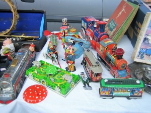 Les jouets mécaniques métalliques de collection sont dotés d´une clef de remontage afin de remonter le mécanisme à ressort. Une vue du stand de René avec ses jouets mécaniques en métal agrafé.