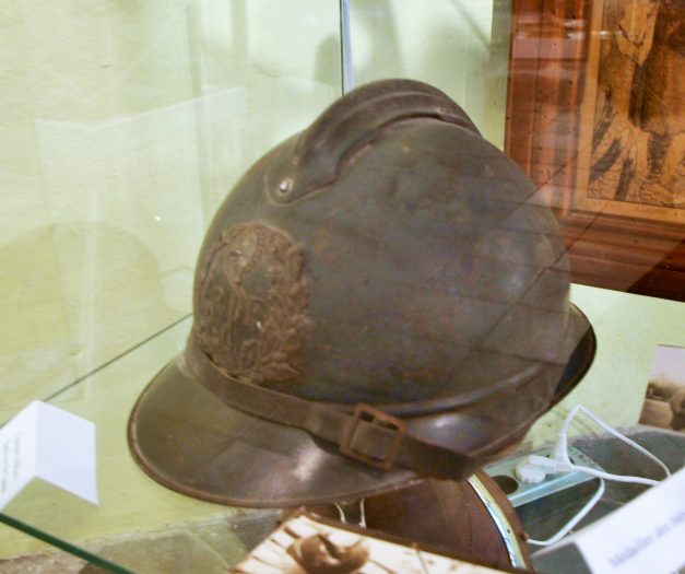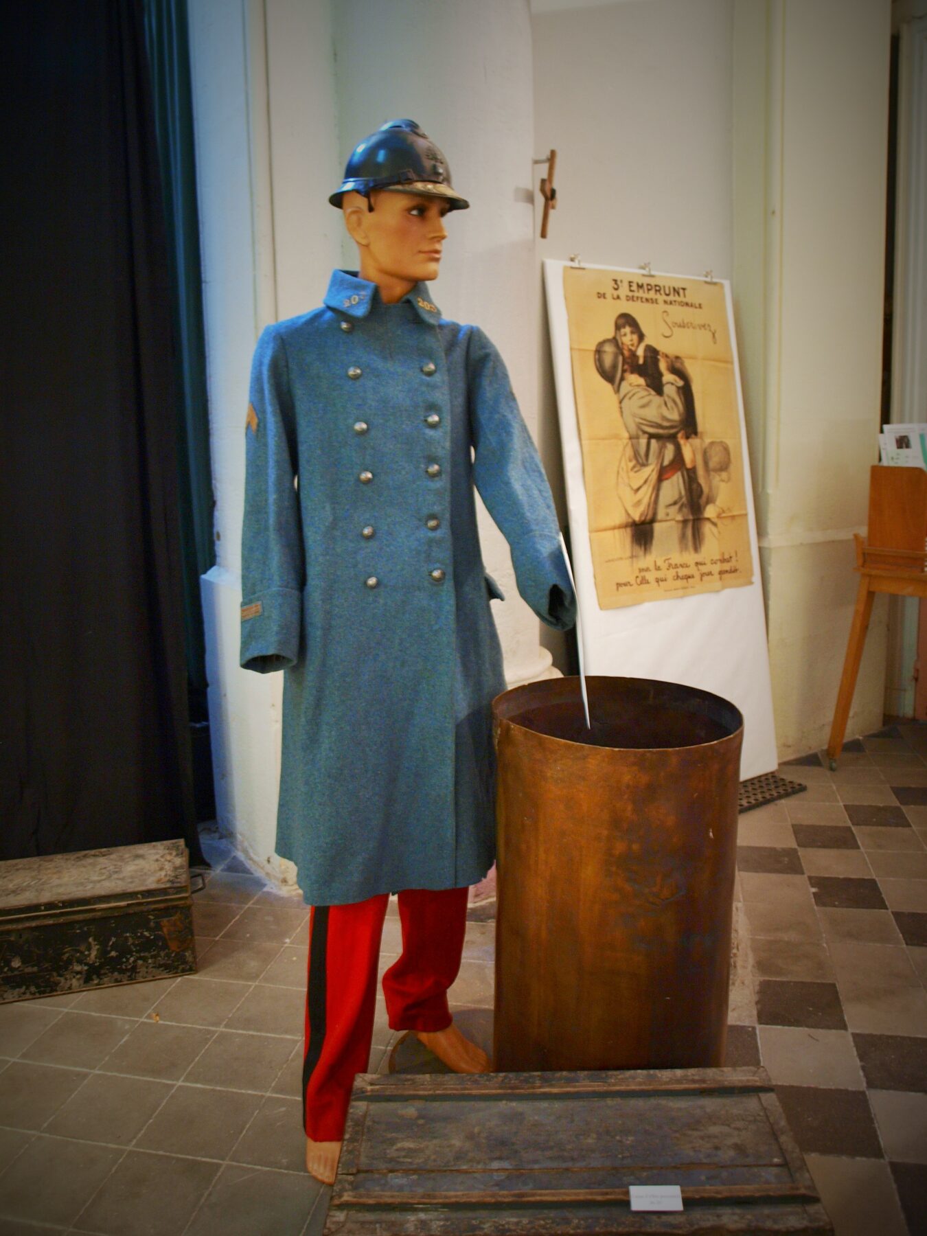 Balade dans l’exposition dans l’église de Rochemaure, le 61eme régiment d’infanterie commandé par le colonel Leblanc quitte Privas le 6 aout 1914, il se dirige vers la Lorraine, à Dieuze le régiment est accueilli par un violent feu de mousqueterie le 19 aout, le lendemain des vagues d’assaut partent vers les lignes ennemis, dans ce premier contact avec la guerre l’Ardeche perdra plus de 450 des siens. Uniforme de capitaine: tenue de sortie du 61eme R I, sabre d’officier cuirassier 1854.