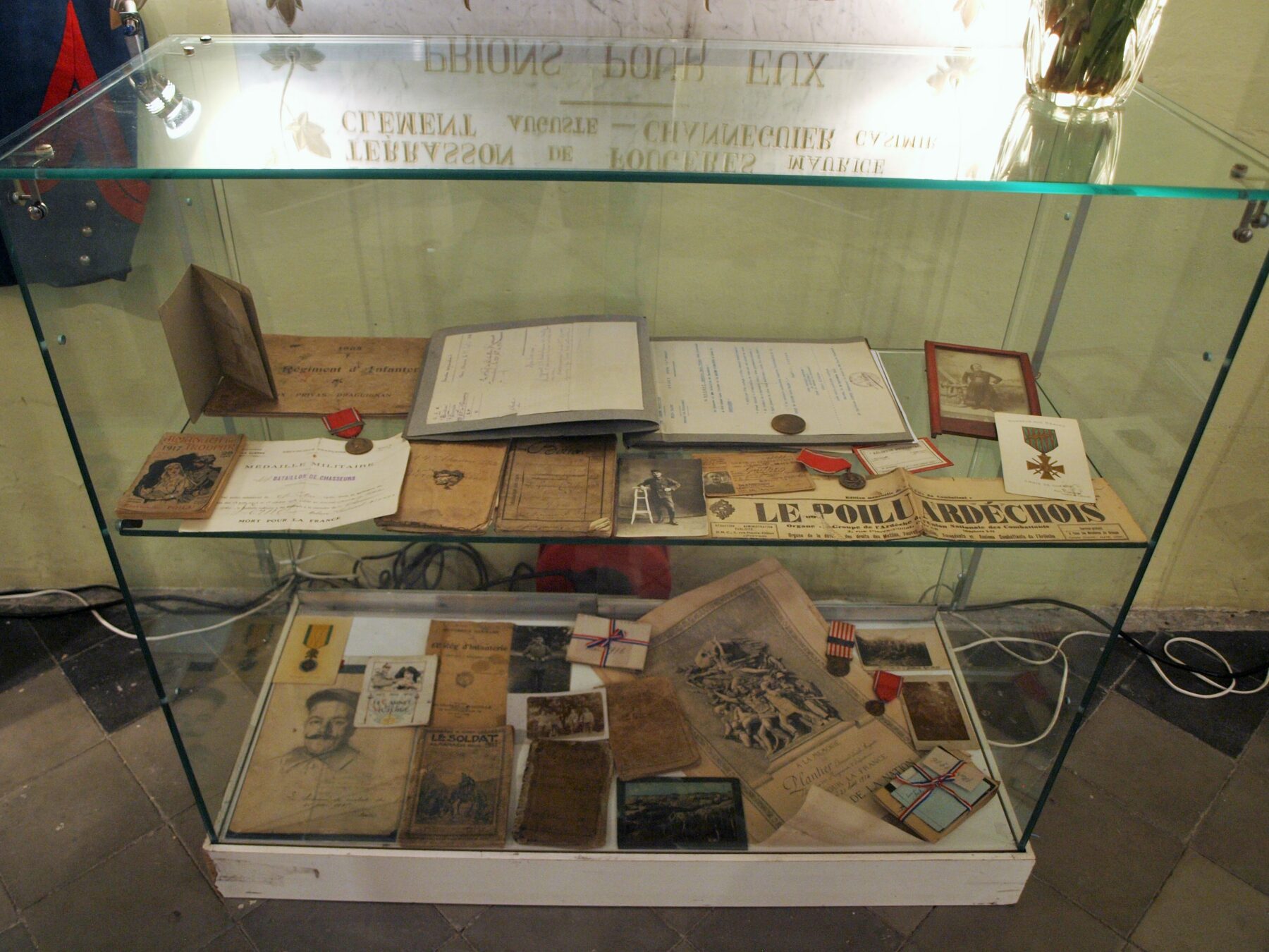 Vitrines avec des documents des soldats de l’Ardèche, journal du poilu ardéchois une édition mensuelle, courriers et carte postale, photos, acte de remise de médaille militaire pour un soldat mort pour la France, bataillon de chasseurs alpins. Un hommage à la nation.