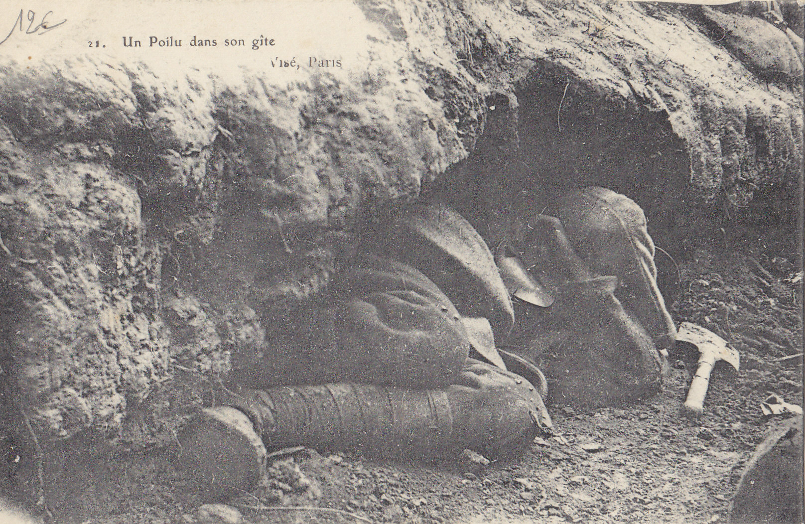 Abri : Thibault Louis 14 mai 1915; Aujourd’hui, sans avoir tout le confort nécessaire, je suis mieux installé. En effet, depuis l’attaque, nous étions constamment occupés à nous déplacer dans le terrain conquis,là, pas de maisons, pas d’eau, sauf celle du ciel qui n’arrête pas. Nous avons creusé un abri et je m’y suis installé.