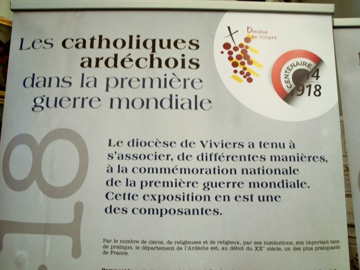 Beaucoup de contributions de la part des particuliers et des collectionneurs pour que cette manifestation soit un succès, l’église s’est paré des drapeaux bleu blanc rouge de la commune de Rochemaure représentant des classes 1903, 1904 ,1899, itinéraire libre pour la visite, avec une partie avec des vitrines pour l’exposition des objets venant de familles ardéchoise, des souvenirs souvent émouvants de cette Grande Guerre, et une autre partie des panneaux expliquant les débuts de la guerre, la guerre vu de l’Ardèche, le courrier des poilus à la famille, et vers la nef les catholiques Ardechois au front. Le diocèse de Viviers a tenu à s’associer de différentes manières à la commémoration nationale de la première mondiale. Cette exposition en est une des composantes.