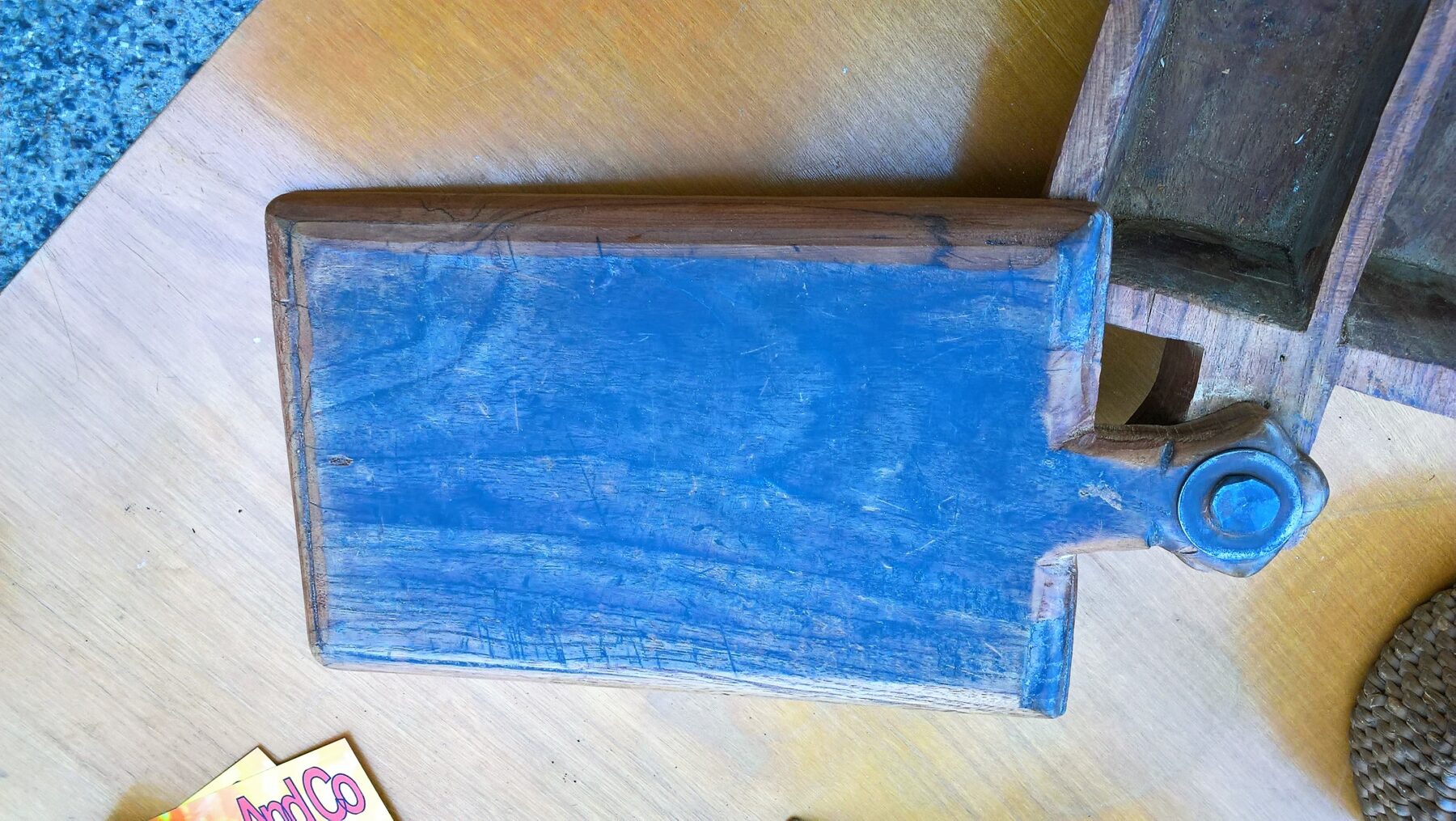 De conception très fonctionnelle avec son couvercle pivotant, elle conservait et cachait précieusement à l’intérieur ses épices. longueur environ trente centimètres, largeur dix-huit centimètres, profondeur sept centimètres.