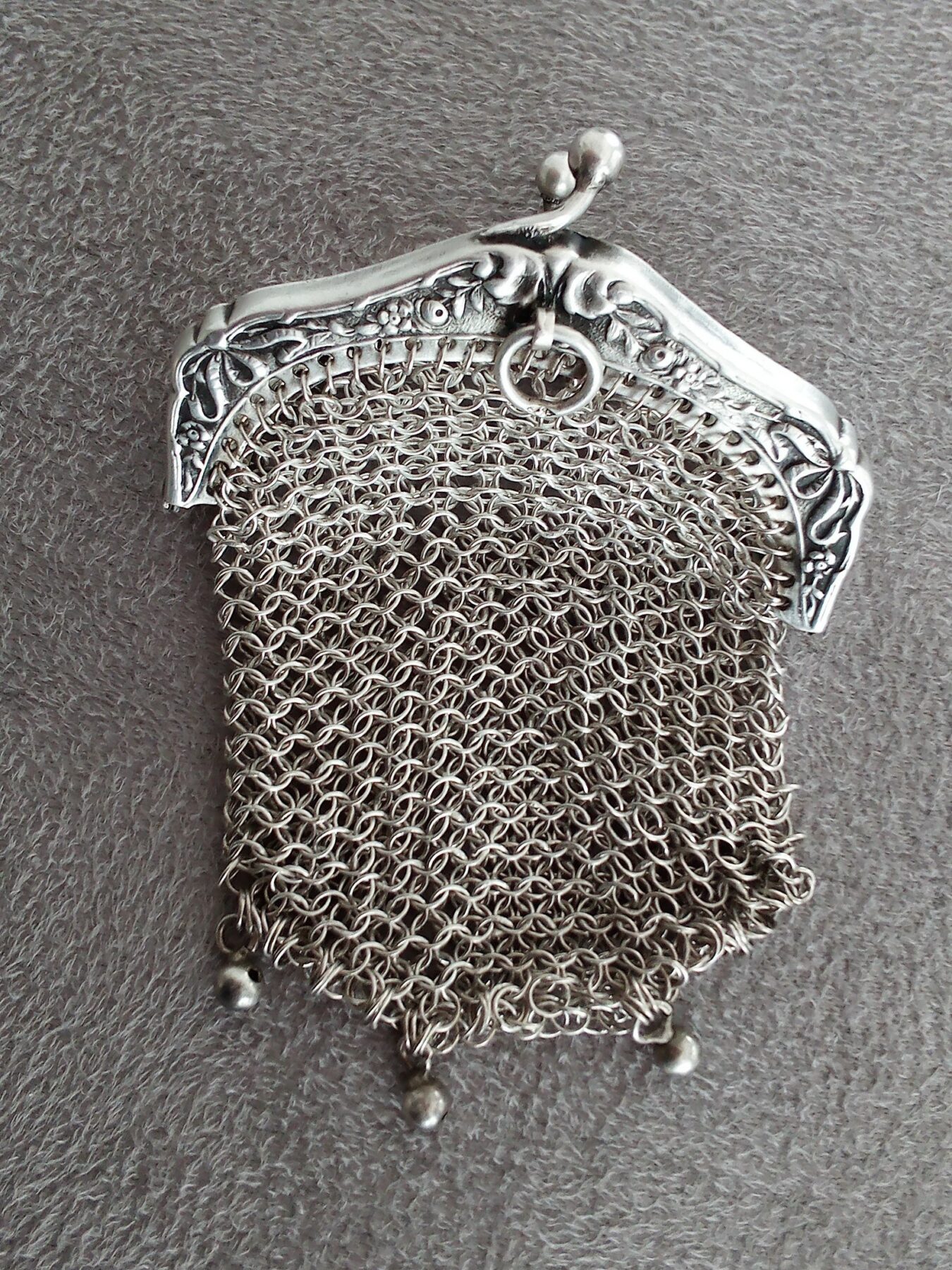 Petite bourse porte monnaies aumônière ancienne en argent, côte de mailles fermoir en forme de baiser. Début XXème. Un très joli petit objet de châtelaine.