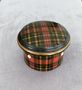 Un objet de mercerie qui prends une place un peu à part dans les collections: les Tartanware. D’abord l’histoire d’une petite ville d’Ecosse. Dès le début du XIXe siècle à « Mauchline » des artisans créent des articles en bois de petites tailles. Ils utilisent le sycomore et le bouleau. Peints à la main les thèmes représentent des paysages de la contrée. Ensuite les motifs de tartan les réputés tissus propres aux clans Écossais. Tartan étoffe de laine à grands carreaux de diverses couleurs que les Écossais utilisent pour la confection de certains vêtements. Une production très variés objets: boîtes à usages divers, et des petits outils liés à la couture, mais aussi des tabatières tirelires etc.