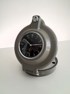 De forme ronde une couleur vert gris (militaire ou industriel) un cadran noir surmonté d’un cercle argenté avec aiguilles heures et minutes. Quand il fonctionne la croix ajourée tourne et passe du rouge au blanc dans la même cadence. D’un poids d’un kilogramme une hauteur de 17 centimètres épaisseur de presque 6 centimètres permet une utilisation facile en décoration.