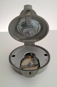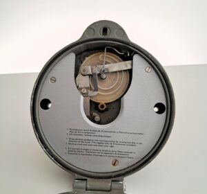 Il peut se fixer verticalement 2 trous à l’intérieur du boitier sont prévuspour des vis. A l’ouverture c’est toute la façade bascule vers le bas grâce à une charnière. Un fonctionnement manuel. Après avoir mis cette pendule à l’heure, nous la remontons en tournant un grosse molette situé à l’intérieur. En effet tout fonctionne. Le temps s’écoule en regardant la petite croix qui donne le rythme en changeant de couleur.